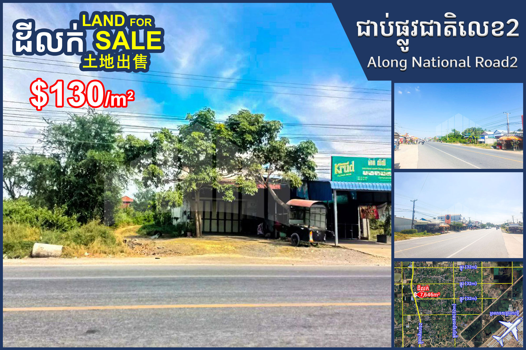 Urgent Land For Sale along National Road 2, New Airport Area, Near Prek Sleng High School